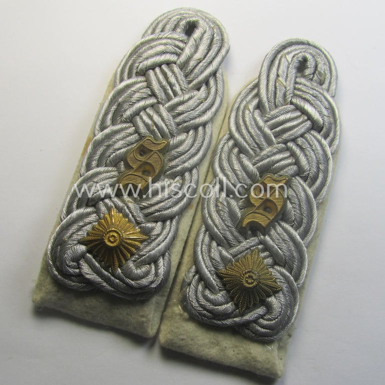 The attractive - clearly issued and just moderately worn! - pair of neatly 'cyphered', WH (Heeres) officers'-type shoulderboards is piped in the typical white- (ie. 'weisser'-) coloured branchcolour: as such, the pair was intended for usage by a fairly high-ranked officer holding the rank of an: 'Oberstleutnant der Infanterie-Truppen u. Mitglied einer Infanterie-Schule' (ie. lieutnant-colonel who served within the infantry-troops and member within one of the infantry-schools). The attractive pair - which is constructed from the white- (ie. 'weisser'-) coloured, 'smooth'-type (ie. moleskin-like-) wool - comes in an excellent condition overall and will be hard to be upgraded (the pair is fully matching in all details as can be seen on the pictures). The somewhat 'shiny' appearance of the 'upperdecks' is fully present and/or preserved (something that is to be expected for a 'Heeres'-related, I deem 'dress'-type shoulderboard-pair). The boards are just a tiny bit 'tarnished' by normal age and/or storage for decades and do show some age and/or staining (as can be seen on the pictures). The neat boards - which measure approximately 11,5 cms. in length each - show a matching set of (neatly golden-toned, larger-sized- and/or fully identical) Gothic-styled: 'S'-cyphers and a pair of (equally-styled, regulars-styled) pips period-attached, denoting that the officer who wore these was a member ie. officer who served within one of the: 'Infanterie-Schulen'. All four devices are just minimally stained- ie. tarnished but have preserved a fine and fairly bright- (and/or quite shiny) age-patina. The boards never had any tongues attached and were clearly intended for usage (and worn as!) as a pair of the 'sew-in'-pattern (as can be seen on the pictures). This pair originated from an older shoulderstrap ie. board-collection that I recently acquired for the web-site. Simply a very attractive, 'Heeres'-related officers'-type shoulderboard-pair that was intended for usage by an: 'Oberstleutnant der Infanterie-Truppen u. Mitglied einer Infanterie-Schule'!