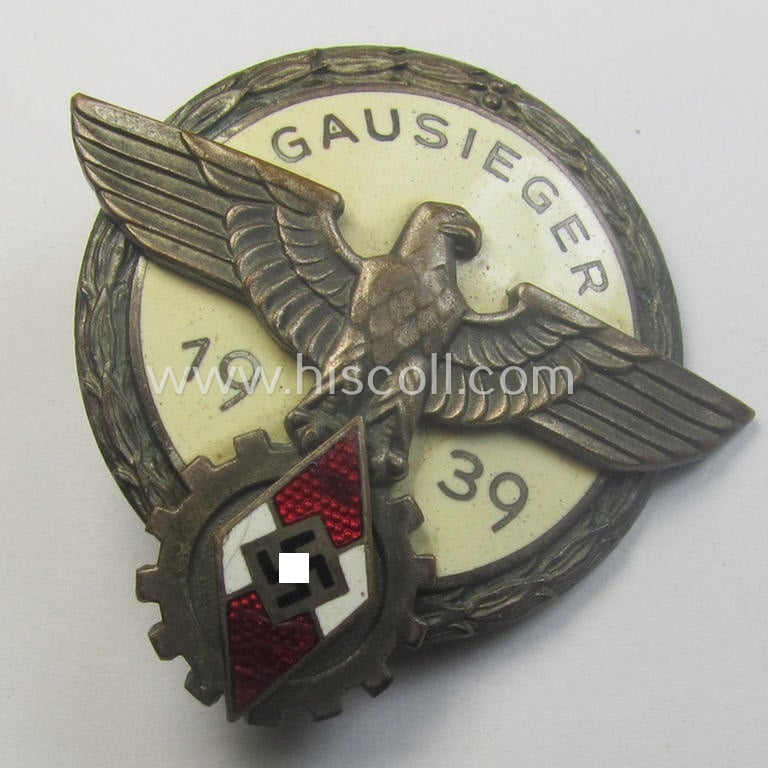 'Buntmetall'-based, 'HJ'- (ie. 'BDM'-) related so-called: 'Reichsberufswettkampf-Siegerabzeichen' (of the 2nd model) entitled: 'Gausieger 1939' and being a neatly maker- (ie.: 'G. Brehmer'-) marked example