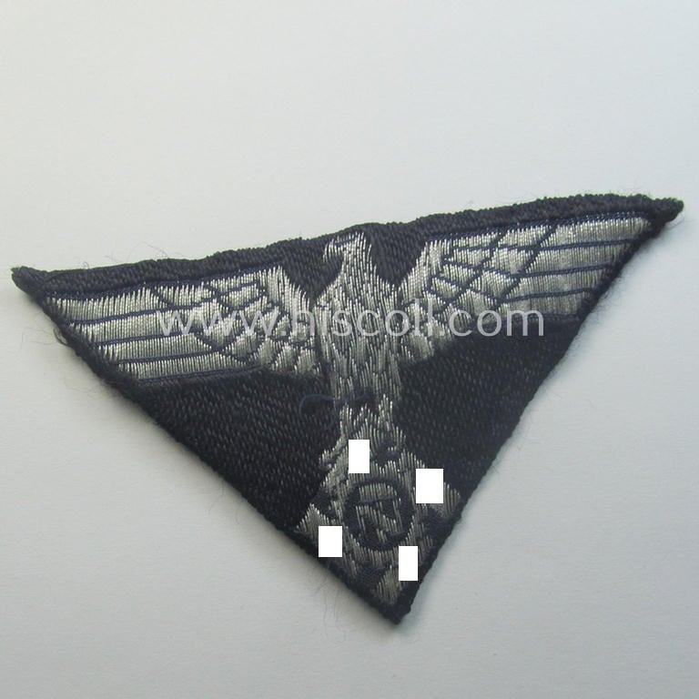 This is an attractive - and actually not that easily encountered! - TeNo (ie. 'Technische Nothilfe') (I deem) officers'-pattern arm-eagle (ie. 'Ärmeladler für Offiziere der TENO') being a non-maker-marked example as executed in so-called: 'BeVo'-weave, 'flat-wire'-pattern onto a (neatly 'padded') darker-blue-coloured background and that comes in an overall nice- (ie. I deem clearly used- and/or carefully tunic-removed-), condition. The piece is neatly executed in so-called: 'BeVo'-weave, 'flat-wire'-pattern and was nicely confectioned, trimmed and/or once tunic-attached (as can be noticed on the pictures). The eagle is void of any damage or alike and still shows extraordinary detail (as can be noticed on the pictures). Simply an attractive piece of miscellaneous TR-tunic-insignia that comes actually not that often for sale!