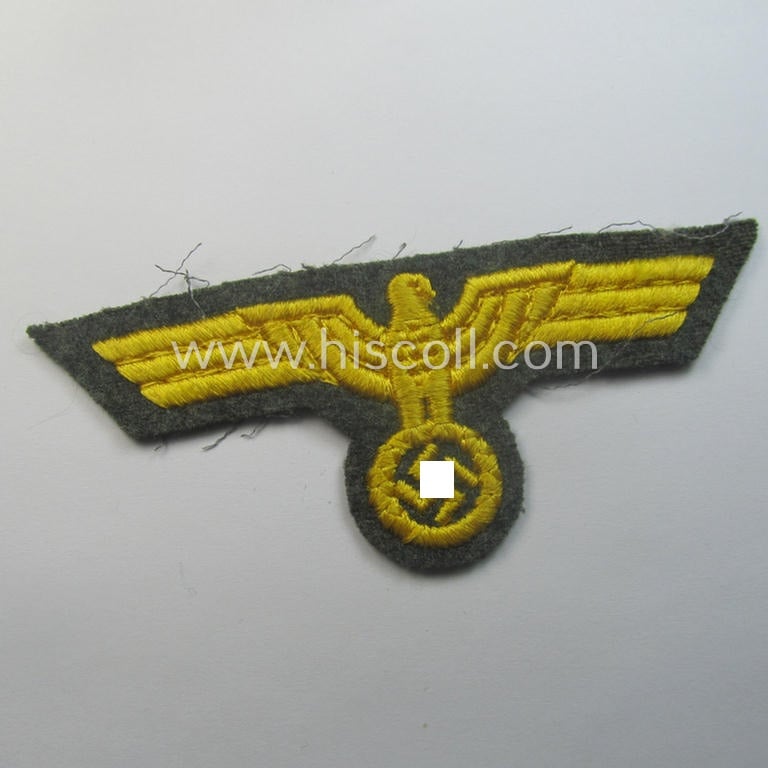 This is an very attractive example of a WH (Kriegsmarine) breast-eagle (ie. 'Brustadler für Mannschaften u. Uffz. der Kriegsmarine o. Küsten-Artillerie') being a 'standard-pattern'- and machine-embroidered example on a field-grey-coloured (and typical woolen-based!) background and that comes in a simply never used- (ie. still 'virtually mint'-), condition. The piece - which is of the pattern that was worn on the various field-grey-coloured tunics and attire throughout the war - comes in a never tunic-attached condition. It is nicely machine-embroidered in golden-yellow-toned linnen and is executed on a typical, field-grey-coloured- (and woolen-based) background. The piece - that is void of an additionally 'backing' but that shows a cheese-duck-based reinforcement (as can be noticed on the pictues) - just shows some minor staining simply caused by handling and storage. This example originated from a small naval breast-eagle-collection I recently acquired for the web-site. I deem that this very attractive - and moderately used! - WH 'Kriegsmarine o. Küsten-Artillerie- o. Küstenmarine'-related breast-eagle is accordingly priced!