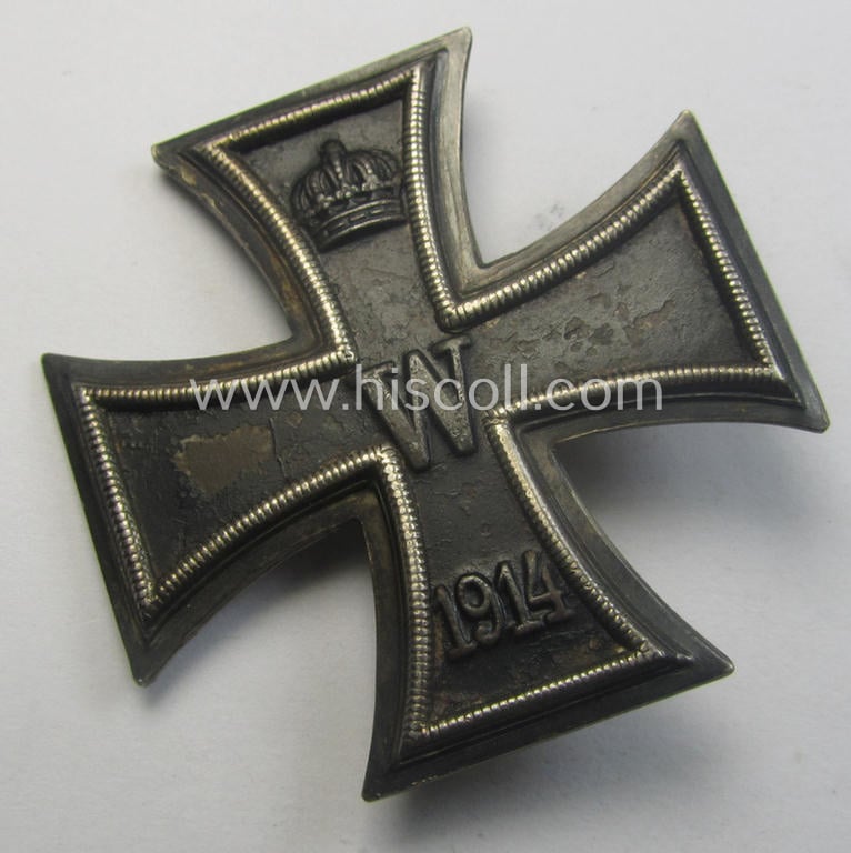 The attractive albeit clearly worn, WWI-period iron cross first-class - which is a typical non-vaulted (ie. non-converse-) shaped example as more often encountered - has - I deem - never been (recently) cleaned and retains a very nice- (albeit clearly tarnished) age-patina and/or great pronounced detail. This WWI-period example - which is a (partly) genuine-silver-based- ie. magnetic example as more often seen - comes mounted onto its original (and naturally fully functional) flute-shaped pin and has a totally unaltered (and also functional) catch (as can be seen on the pictures). The cross - which shows a nicely preserved, 'blackened'- and/or fairly 'satin-like'- ie. somewhat 'matted'-like 'inner-core' - shows some minimal age and does show some usage ie. minimal paint damage: it retains a very nice appearance overall. The piece is as stated above showing a clear makers'-designation on its back that reads: 'K.O.' (as can be seen on the pictures) being a designation that was I deem used by the maker (ie. 'Hersteller') named: 'Klein & Quenzer' based in the town of Oberstein. The cross is, moreover, just a bit dirty and tarnished simply caused by years of storage and/or moderate wear but retains a great unmessed-with and/or uncleaned, age-patina. Simply an attractive IC-first-class that was never before part of a collection: I deem that I have priced this attractive WWI-period example, accordingly!