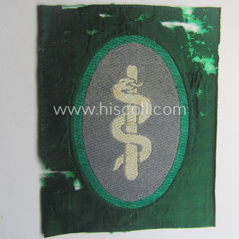 This is a truly attractive - and actually quite scarcely encountered! - example of a neatly 'BeVo'-woven, so-called: 'Sicherheits- u. Hilfsdienst' (ie. 'SHD'-) armbadge (ie. 'Ärmelabzeichen') being a greyish- (ie. white/green-) coloured example depicting an: 'Aesculapus'-symbol as was intended for a member serving as a: 'Feldscher' (ie. 'SHD-Sanitäter' or: medical-orderly) and that comes in an overall very nice- (ie. 'virtually mint- ie. unissued'-), condition. The badge - which depicts a white-coloured, 'Aesculapus'-symbol onto a greyish- (and green-rimmed) coloured background - was introduced in late 1941 and was one of a series of - at least - six different such SHD speciality- ie. trade-badges. These 'specialist' badges were worn on the left upper-arm. The piece on offer here comes in a truly 'virtually mint- ie. unissued'- (and of course fully unconfectioned-), condition: it just shows some (non-disturbing) damage on its background (as can be noticed on the pictures). Simply an attractive - and actually scarcely encountered! - 'SHD'-arm-patch as was used by one of the lesser known TR-organisations!