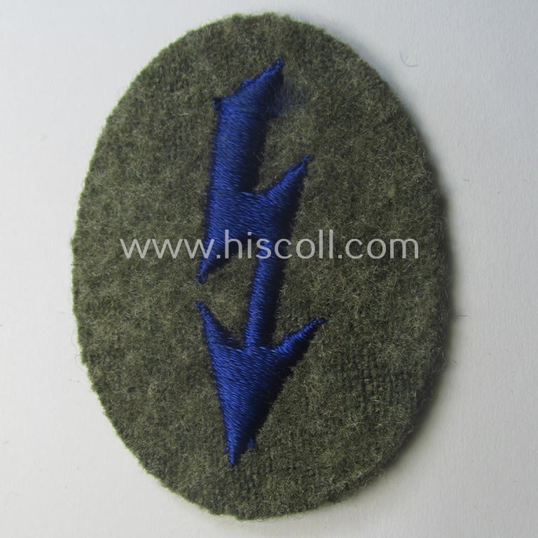 This is an attractive - and actually in this branchcolour very scarcely found! - example of a so-called: WH (Heeres) trade- and/or special-career-insignia (ie. 'signal blitz') as was executed in the darker-blue- (ie. 'blauer'-) coloured branchcolour as was specifically intended for a 'signals-operator' (or: 'WH-Nachrichten Personal') ie. soldier serving within the: 'Sanitäts-Truppen' (ie. army medical-troops) and that comes in an overall very nice- (I deem simply never used- nor tunic-attached-), condition. The patch is neatly machine-embroidered on field-grey-coloured wool and shows no defaults whatsoever: it was (I deem) never tunic-attached nor used. The 'blitz' is darker-blue- (ie. 'blauer'-) coloured and was as such intended for a: 'Sanitäts'-soldier (ie. medical-orderly). The patch is a non-maker-marked example and just shows some minimal age ie. staining simply caused by years of storage only. This example is not additionally 'backed' as is more often seen. It should be be noted that this is one of the hardest to encounter specimen of the extensive series. Simply a very attractive 'Sanitäter-Signal-Blitz' that will be impossible to be upgraded and that is priced according to its unmistaken scarcity!