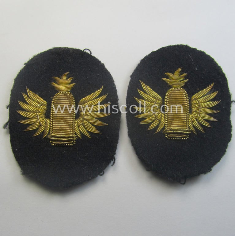 Both detailed WH (Kriegsmarine) badges - which were to be mounted on both lower-arm-regions of the various blue-coloured officers'-(ie. evt. NCO-) type- tunics - depict a 'winged-shell'-device (as can be seen on the pictures). They are executed in bright-yellow- (ie. golden-) coloured braid onto a dark-blue-coloured and/or typical woolen-based background and were as such intended for usage onto the blue-coloured navy attire. Both insignia-pieces do show extraordinary craftmenship and are additonally backed with a piece of black-coloured paper (as can be seen on the pictures). The set was clearly used ie. once tunic-attached (some of the period stitching-holes are still visible) and both show some minimal age ie. staining caused by minimal wear and/or decades of storage. It sounds maybe strange but all WH (Kriegsmarine) officers'-type-, career- ie. specialist-armbadges as specifically related to the 'KM-Küstenartillerie-Truppen' are very hard to encounter and can easily be graded fairly 'scarce'.