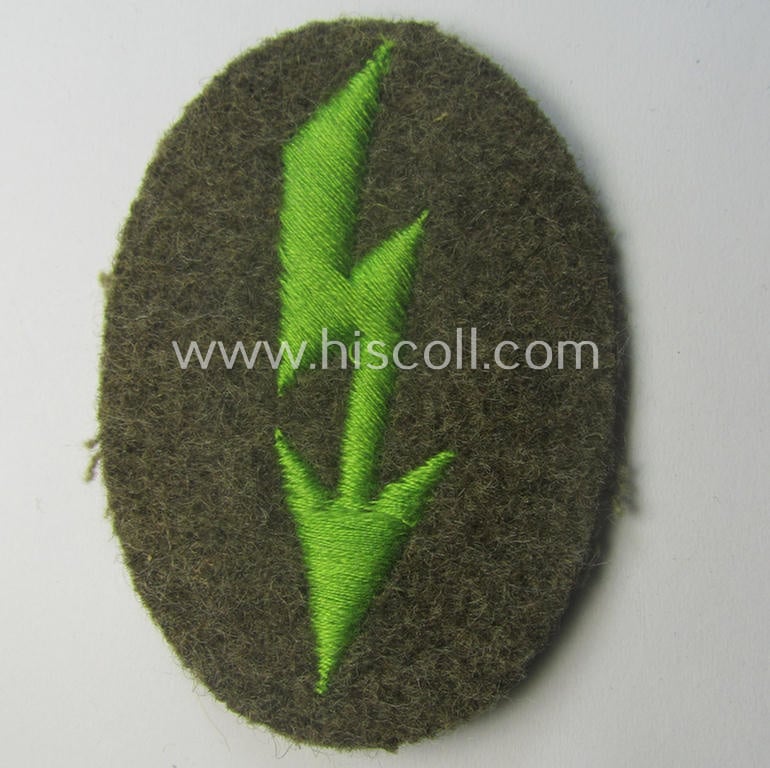 This is a neat - and I deem early-war-pattern! - WH (Heeres) 'tropical-styled', trade- and/or special-career insignia (or: 'Signal Blitz') as was intended for usage by a 'signals-operator' (or: 'WH-Nachrichten Personal') as was executed in machine-embroidered bright-green- (ie. 'hellgrüner'-) coloured linnen onto an earthen-brown-coloured- and/or (typical) woolen-based background as was intended for a soldier who served within the: 'Panzer-Grenadier-Truppen' (or: simple soldier ie. NCO who served within one infantry-related, so-called: rifle-regiments ie. units) and that comes in an overall very nice- (ie. 'virtually mint- ie. unissued'-), condition. The patch - which is additionally 'backed' with a piece of beige-coloured linnen - is a (typical) non-maker-marked- and machine-embroidered example that shows some minimal age ie. staining simply caused by decades of storage only (as can be seen on the pictures). Simply a nice occasion to acquire a neat - and I deem early-pattern! - 'tropical-issue'- ie. DAK- (or 'Deutsches Afrikakorps'-) related: 'Signal Blitz' as was intended for a soldier serving witin the: 'Panzer-Grenadier-Truppen'!