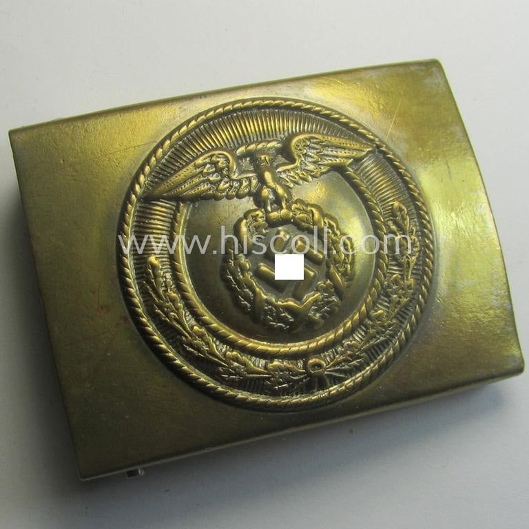 This is neat - albeit unmarked and typically regular-sized! - example of a pre-war-period, so-called: N.S.K.K.- (ie. 'National Socialistischer Kraftfahr Korps') related and (once) silvered-copper- (ie. 'messing'-) based belt-buckle being a 'variant'-pattern- (ie. 'single-pieced'-constructed) example that comes in an overall nice- (albeit clearly worn and/or period-cleaned), condition. The buckle - having a 'regular'-shaped swastika - is still a bit dirty and shows some dust and/or staining as acquired over the years. The buckle is of the 'variant'-pattern- (ie. 'single-pieced'-construction) and was (regrettably) once cleaned and/or polished: almost all of its (originally silver-toned) finish is missing (and is only still visible on its back). The buckle is void of any makers'-mark or logo (as is more often encountered) and shows nice and/or pronounced detail but also shows the obvious signs of having been moderately worn (it is still a bit dusty as found and comes as stored for decades). Still a neat example of an N.S.K.K.-related belt-buckle that is priced according to its polished condition!