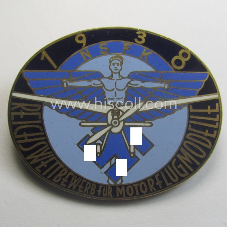 Commemorative, N.S.F.K.-related brooch (ie. 'Brosche') being a maker- (ie. 'Brehmer'-) marked example depicting the N.S.K.K.-logo (ie. 'fliegender Mensch') and text: 'N.S.F.K. - Reichswettberwerb für Motorflugmodelle - 1938'