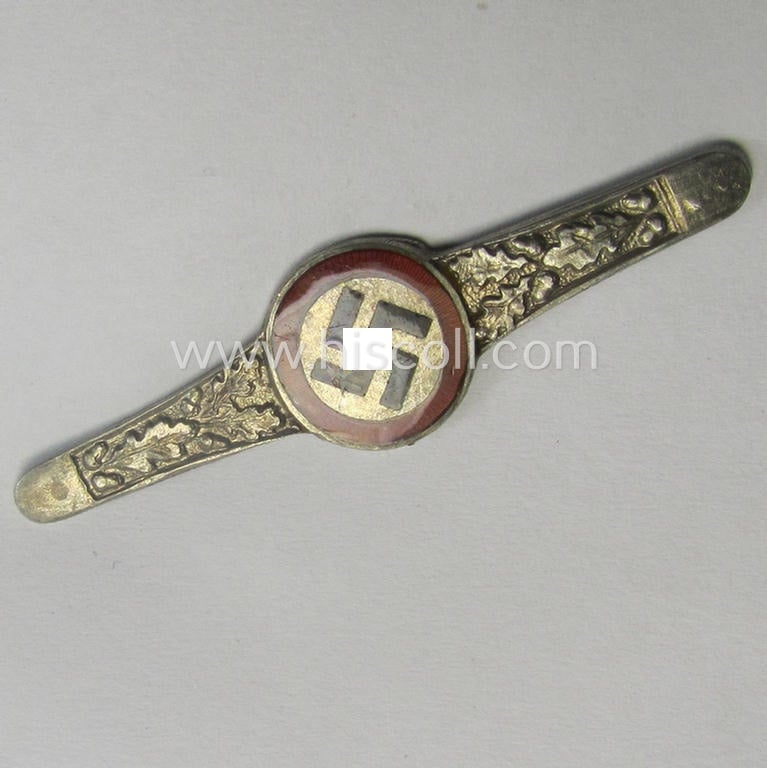 Unusually found - and actually scarcely seen! - smaller-sized, I deem genuine silver-based and neatly enamelled so-called: 'Brosche' (ie. supporter-brooch) showing a smaller-sized 'Parteiabzeichen'