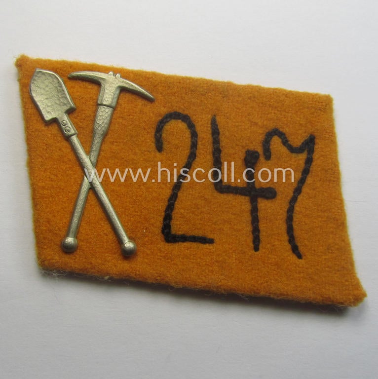 This is a neat - with certainty seldomly seen albeit regrettably single! - specific SA (ie. 'Pionier-Sturmabteilungen') collar-patch (ie. 'Kragenspiegel für Mannschaften u. Uffz. der Sturmabteilungen') as executed in the orange-yellow- (ie. 'goldgelbener'-) coloured wool as was (I deem) intended for usage by an: 'SA-Mitglied' serving within the: 'SA-Pionier-Standarte 247' ('SA-Gruppe Elbe o. Neckar') being a just moderately used- (and I deem carefully tunic- ie. shirt-removed-) example. The piece - that shows a typical 'buckram'-based 'backing' as to be expected - comes in an overall very nicely preserved condition and shows the (black-toned) '247'-numerals (ie. cyphers or 'Ziffern') as executed in black-coloured linnen- ie. wool coupled with a (silver-toned- and 'Buntmetall'-based) pick-axe and shovel-cypher. The '247'-numerals are executed by means of so-called: 'Kurbelstickerei' (as can be seen on the pictures). This particular example still retains its period RzM-etiket glued on its back (something that is not always the case). Simply a nicely preserved - and most certainly not that easily encountered! - SA-Kragenspiegel that belonged to an: 'SA-Mitglied' serving within the 'SA-Pionier-Standarte 247' (belonging to the: 'SA-Gruppe Elbe o. Neckar') and that is I deem accordingly priced!