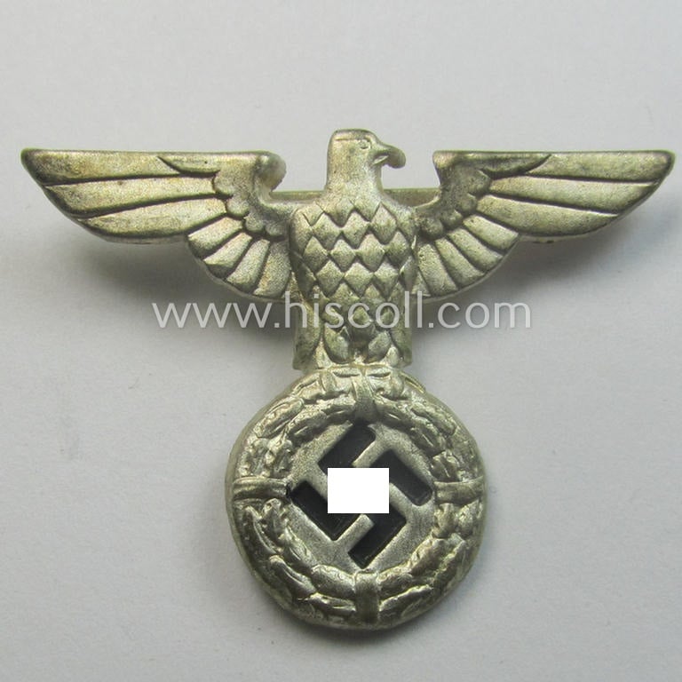 Silver-toned - and I deem 'Buntmetall'-based - early-pattern, SS- o. SA-type, political visor- (ie. 'Schirmmützen'-) cap- (ie. 'Kepi'-) eagle being a non-maker-marked example that comes in a still 'virtually mint- ie. unissued'-, condition