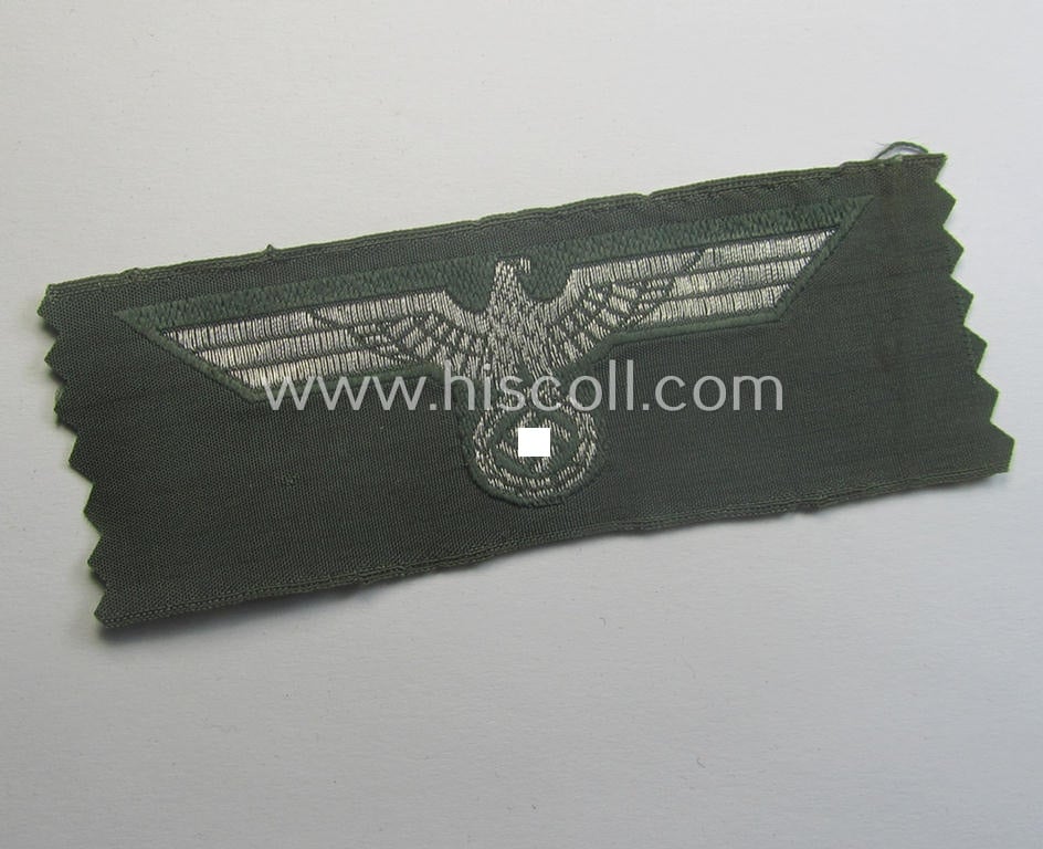 This is an attractive - and simply never used- nor cap-attached and actually not that easily encountered! - WH (Heeres) 'flatwire'-woven, officers'-type overseas cap-eagle (ie. 'Offiziersadler für Schiffchen') as was also intended for usage on the: 'Knautschmützen o. Alter-Art-Schirmmützen' ie. visor-caps and that comes in an overall very nice- (ie. simply never used- ie. 'virtually mint'-), condition. These desirable cap-eagles were intended for usage on the popular so-called: 'Knautschmützen' ie. 'Alter-art' visor-caps but saw also usage on the 'high-quality' officers'-type 'Schiffchen' (ie. side-caps). The eagle is executed in bright-silver-grey- ('flatwire'-type) thread on a field-grey-coloured background and comes in a non-used condition: it comes 'as straightly cut-of-the role' (as can be seen on the pictures). It should be noted that these attractive 'flatwire-woven'-type cap-eagles are seldomly offered for sale and can as such easily be graded 'fairly scarce'. Simply a great occasion to acquire an attractive piece of German cap-insignia for a competitive price!