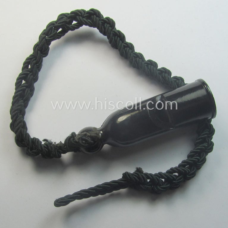 This is a neat - and actually not that commonly encountered! - HJ- (ie. 'Hitlerjugend'-) personal-equipment-item: a genuine period, black-coloured- and (I deem) resin-based flute (ie. 'Dienstflöte') that comes mounted onto its original (greenish-coloured- and twisted) lanyard and that comes as issued and/or recently found. These flutes were 'standard'-equipment items for the various youth-staff (ie. NCOs) and were used during exercises and/or training. The lanyard - as well as the flute - show some moderate wear and usage but nothing too shocking (as can be noticed on the pictures). Simply a neat HJ-personal-equipment-item that comes in a nicely preserved condition and that is I deem accordingly priced!