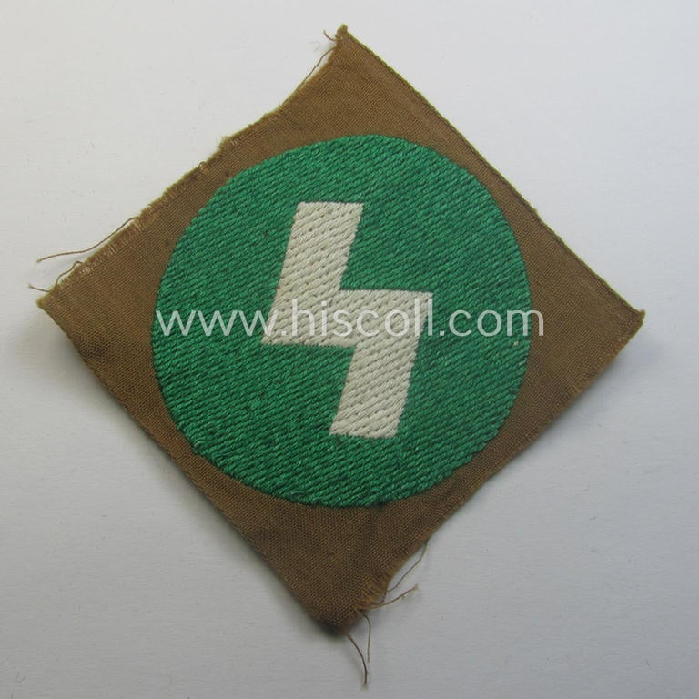 This is a neat example of a DJ (ie. 'Deutsches Jungvolk') arm-badge as was specifically intended for usage by a member who served within the: 'Oberbann 3' being a 'virtually mint- ie. unissued' example that is void of an 'RzM'-etiket and that comes in a simply never used- nor worn-, condition. The white-coloured rune-sign - as executed on a bright-green- (ie. 'grüner'-) coloured background and woven in the neat so-called: 'BeVo'-weave pattern as always - signified that its bearer belonged to the DJ 'Oberbann 3'. The patch shows some minimal staining ie. dust simply caused by decades of storage only. Simply a nice occasion to acquire an attractive example of a 'DJ-Oberbann 3'-armpatch that will be hard to be upgraded!