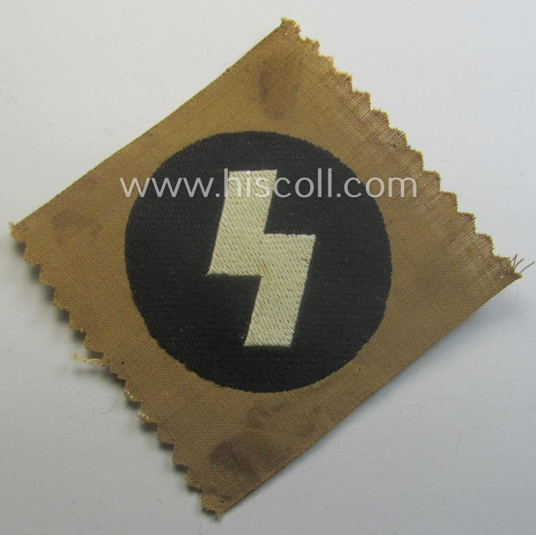 This is a very attractive - and truly rarely found! - DJ (ie. 'Deutsches Jungvolk') arm-badge as was intended for usage by a member who served within the: 'Oberbann 5' and that comes in an overall very nice- (ie. never used- nor worn- ie. 'virtually mint- and unissued'-), condition. The white-coloured rune-sign - which is executed on a black-coloured background and is woven in the neat so-called: 'BeVo'-weave pattern as always - signifies that its bearer belonged to the: DJ 'Oberbann 5'. The badge - that is void of an RzM-etiket - shows some slight staining ie. dust simply caused by decades of storage only. Simply a very attractive - and truly rarely found! - example that will be impossible to be upgraded. Without doubt one of the most difficult to encountered specimen of the series of six different ones!