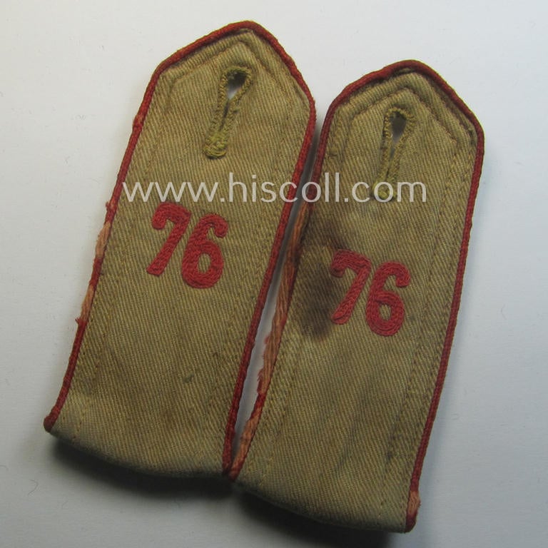 This is a neat - truly ie. heavingly used but nevertheless not that easily found! - typical early-pattern, so-called: 'HJ'- (ie. 'Hitlerjugend'-) shoulderstraps as was (I deem) intended for usage - and clearly worn! - by a: 'Hitlerjunge' who was attached to the: 'Oberbann 1 - Bann 76' (Bann 76 = 'Bann Otto Blöcker' situated in the 'Gebiet Nord Hamburg') and that comes in an overall nice- (I deem clearly used- ie. carefully tunic- or shirt-removed-), condition. The straps - which are executed in typical, beige-tan-coloured linnen as to be expected - have the bright-red-coloured- (and typical rayon-based) piping attached (that shows some damage and wear) and that show the machine-embroidered - by means of 'Kurbelstickerei' (and/or equally coloured) so-called: '76'-numerals (ie. 'Ziffern'). The straps never had a tongue attached and come as found and/or issued: the boards are of the 'sewn-in'-pattern (and were also used as such): both straps show 2 metal-based 'snaps' (which were period-attached and used for easy tunic-attachment). The straps - that are void of an 'RzM'-etiket - measure 11,7 cms. in length each and do show clear age ie. staining simply caused by moderate wear and/or decades of storage. It should be noted that all 'cyphered' (ie. 'Hitlerjugend') shoulderstraps can easily be graded 'scarce' even more so when they are of the desirable early-pattern. Simply an attractive - and actually not that commonly encountered! - so-called: early-pattern, 'Oberbann 1'-shoulderstrap-pair that belonged to the 'HJ-Bann Otto Blöcker' as was based in the 'Gebiet Nord Hamburg'!