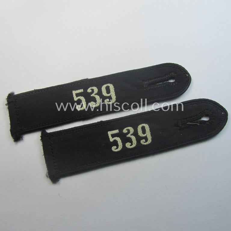 I recently uncovered two - fully identical and truly 'virtually mint- ie. unissued'! - examples of the: 'DJ- o. Deutsches Jungvolk' shoulderstrap as was specifically intended for usage by the: 'DJ-Mitglieder' serving within the: 'Bann 539' (539 = 'Vöcklabruck') and that both still show their period-attached, 'RzM'-etiket and that come both in a wonderful and/or fully untouched, condition. Both straps are executed in black-coloured wool showing the white-embroidered '539'-numerals and having the black-coloured- (and/or rayon-based) piping attached. They come without tongue as found: the straps measures 11 cms. in length as is usually encountered and were most certainly intended to be worn as straps of the 'sew-in'-pattern. Both pieces shows some minimal age and/or staining simply caused by decades of storage only. Of additional interest is, moreover, the fact that these examples still show their period-attached 'RzM'-etikets (as can be noticed on the pictures). My asking-price is naturally intended per single specimen. Simply a nice occasion to acquire an attractive so-called: 'DJ- o. Deutsches Jungvolk'-shoulderstrap that was intended for usage within the unusually encountered, Austrian 'DJ-Bann 'Vöcklabruck' as was based in the 'Gebiet 29 - Südost Oberdonau' for a competitive price!
