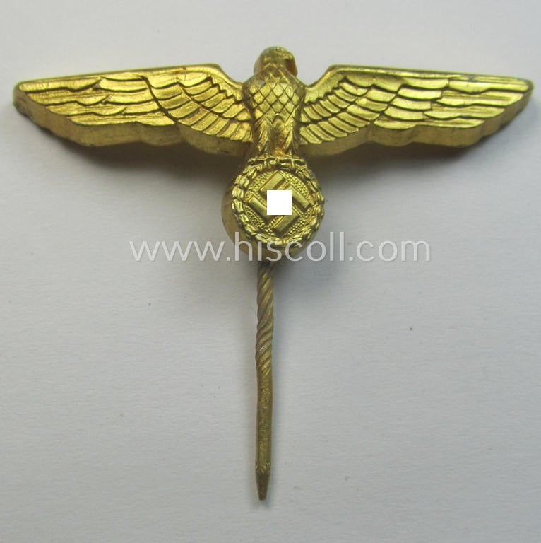 This is an attractive - and actually fairly scarcely encountered! - example of a bright-golden-toned, WH (Kriegsmarine) so-called: 'single-pattern'-eagle-pin a clearly maker- (ie. 'R.S.& S. - 40'-) marked as was specifically intended for attachment onto the (darker-blue- ie. white-topped-) so-called: Kriegsmarine-related: 'Tellermützen' and that comes in an overall nice- (albeit I deem minimally used- ie. most certainly once cap-attached-), condition. The piece on offer here is the so-called: 'one-pieced'-model, showing a bright-golden-toned, aluminium-based eagle-device without attached cocarde. The piece was clearly used ie. worn but nevertheless retains all of its bright golden-toned finish: it is a piece that is neatly: 'feuervergoldet'. The eagle-pin was - I deem - never cleaned and comes as recently found (it does show some minimal staining). The piece is somewhat converse-shaped as more often encountered and comes of course mounted onto its original, full-sized, pin. Simply a nice and/or fairly scarcely encountered naval replacement-piece that is I deem accordingly priced!