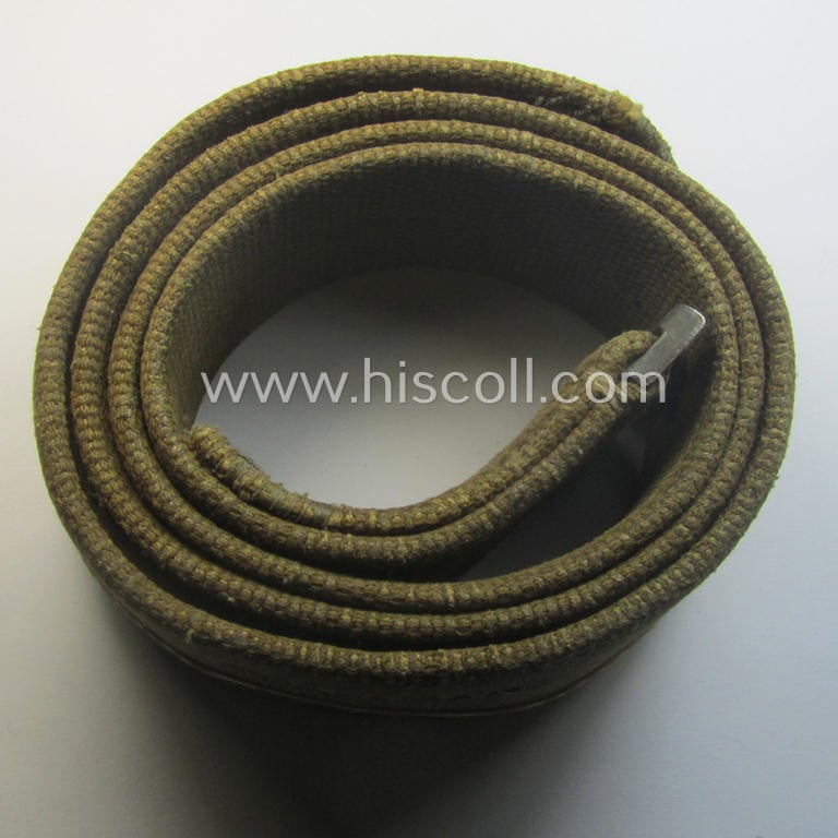 This is an attractive - and I deem only moderately used - example of a WH (Heeres ie. Luftwaffe etc.) 'tropical-issued'- and/or (partly) 'web-based' belt (ie. 'Koppelriemen') as was executed in yellowish-tan-coloured and/or neatly woven linnen (ie. 'webbing') and having a leather-based tongue being a neat example that is approximately 103 cms. sized and that comes in an overall nice- (ie. most certainly issued- albeit moderately used- ie. worn-), condition. The belt shows a stamped makers'-designation that reads: 'Lagesa - Dresden' and is also dated: '1941' (as can be seen on the pictures) but is void of an inked size-stamp. The belts'-tongue is as stated fabricated in typical, brownish-coloured leather (as can be seen on the pictures). The piece was just moderately used and its overall condition is still very nice and of course fully functional. The metal-based catch retains most of its greenish- ie. typical field-grey-coloured finish (that shows some minimal rust-staining). Hard to find a more nicely preserved and/or attractive example for a more interesting price: the belt just needs an equally nicely preserved 'Heeres' ie. 'Luftwaffe'-type belt-buckle to complete it. I deem that this nicely preserved example is accordingly priced!