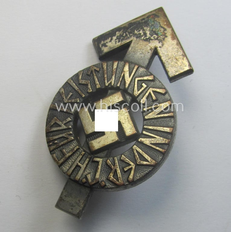 This is a truly attractive - and I deem only moderately used- and/or worn - example of a HJ- (ie. 'Hitlerjugend'-)so-called: 'Leistungsabzeichen in Silber' being a neatly maker- (ie. 'RzM M1/63'-) marked example (as was presumably executed in so-called: 'Cupal') and that is bearing the unique bearers'-number that reads: '116848' on its back and that comes in an overall very nice- (albeit just moderately used- ie. I deem truly worn-), condition. The badge comes naturally mounted onto its functional (and unaltered!) pin- ie. catch set-up and retains a neat (and undamaged) silverish-grey-coloured finish (which is just a bit tarnished and/or slightly dirty ie. stained - as can be seen on the pictures). The detail on this youth-related item is simply stunning and pronounced. Simply a very attractive example of a neat 'HJ'-related sports-proficiency-award!