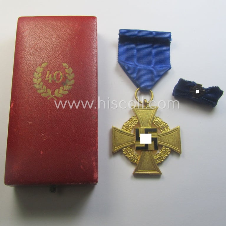 This is an attractive - and I deem just moderately used ie. worn - example of a so-called: 'Treuedienst Ehrenzeichen 1. Klasse' (or: golden-class, loyal-service-medal for 40 yrs. of loyal civil-service) being a non-maker-marked example that comes mounted onto its original ribbon (ie. 'Bandabschnitt') and that comes stored in its non-maker-marked etui as issued and/or recently found. The medal is a truly attractive piece that retains all of its period, bright-golden-coloured- and/or fairly 'frosted' finish: it also retains most (ie. all!) of its 'off-factory applied': 'hochpolierte Kanten' (or: polished sides) but is just a tiny bit stained (it has never been cleaned). It comes mounted onto its cornflower-blue-coloured ribbon which still has its period (golden-toned) attachment-pin in place as was intended for wearing the medal on a tunic. The medal has never been cleaned and has an immaculate (ie. fully undamaged!) enamelled swastika(area). The medal came stored in its original, bright-red-coloured etui that is void of a makers'-designation nor ink-stamp (as can be seen on the pictures). This etui is fully undamaged but does just show some minimal (handling) age and/or minimal staining (as can be seen on the pictures). Of additional interest is, moreover, the fact that this example came with its accompanying single-pieced ribbon-bar (ie. 'Feld- o. Bandspange'). Simply an attractive example that will be very hard to be upgraded!