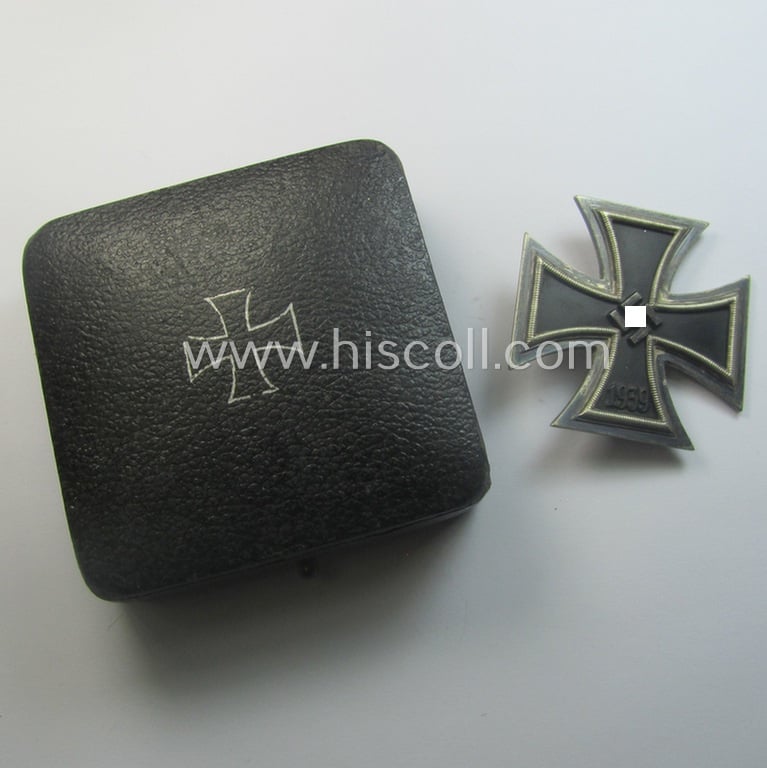 This is an attractive - and I deem just moderately worn- and/or used - example of an: 'Eisernes Kreuz 1. Klasse' (or: Iron Cross 1st class) being a detailed and clearly maker- (ie. '100'-) marked example (visible on the back of the pin as more often) as was produced by the desirable maker (ie. 'Hersteller') named: 'R. Wächter u. Lange' as was based in the town of Mittwaida in Sachsen and that came stored in its original, simulated leather-based- (and fairly luxuriously styled!) etui as issued and/or recently found and that comes in an overall nice- (surely issued and just moderately used- ie. worn-), condition. The magnetic cross has an overall very nice age-patina and retains truly great detail: the black-coloured core shows no rust nor real damage whatsoever: the satin-like (ie. minimally matted), black-coloured painted core is nicely preserved but does show some paint-loss (as can be seen on the pictures). The cross retains, moreover, a fair bit of its 'off-factory applied' polished sides (ie. 'hochpolierte Kanten'). The back of the cross is just a tiny bit stained (but was never cleaned nor polished). The (flute-shaped) pin and catch (ie. set-up) are naturally unaltered and/or fully functional. The etui comes also in a very fine and fully complete condition: the silver-rimmed cross that figures on the etui's top is in a very nice and undamaged condition whereas the yellowish-beige-coloured- and/or velvet-like interior is also present and in place: it is just a bit 'yellowed' by age (as can be seen on the pictures). The cross (ie. fully matching set!) is an evident specimen that was produced by the desirable maker (ie. 'Hersteller'): 'R. Wächter u. Lange' as was based in the town of Mittwaida in Sachsen: it has very nice and/or pronounced detail as to be expected for a cross by this maker. Simply a very attractive - and fully matching! - IC1-set by the 'Wächter u. Lange'-company and that was never before part of a collection: I deem that I have priced this attractive and fully untouched example accordingly!