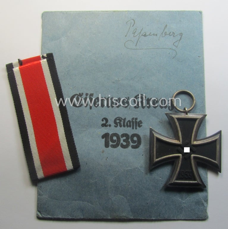 This is an attractive - and fully complete and totally untouched! - example of an: 'Eisernes Kreuz 2. Klasse' (ie. Iron Cross 2nd Class) being a clearly maker- (ie. '65'-) marked example as was produced by the: 'Klein & Quenzer'-company as based in the town of Lüdenscheid and that comes stored in its period, 'Zellstoff'-based pouch and that comes in an overall very nice- (and I deem issued- albeit never used- nor even mounted-), condition. The piece on offer here has never been cleaned and shows a very nice (blackened- and truly 'satin-like'-) patina and shows a fully undamaged, black-coloured 'inner-core'-section. The piece - which does show the clearly present makers'-designation '65' stamped into its ring - has lost most of its polished sides (or: 'hochpolierte Kanten') and does show some minimal storage-age. It came stored in its accompanying, blue-coloured- and 'Zellstoff'-based pouch and came together with its 'virtually mint', full-length- (ie. approx. 29 cms. long-sized-) ribbon (ie. 'Bandabschitt') as issued and/or stored for decades. As stated above has the cross great and very fine detail: it is just a bit 'tarnished' over the years and has never been cleaned (it is just a tiny bit dusty). Of additional interest is, moreover, the fact that the pouch shows an inked name of the recipient (a certain: 'Papenburg' or alike as can be noticed on the pictures). Simply a neat - and complete! - IC-set by the 'Klein & Quenzer'-company that is - I deem - accordingly priced!
