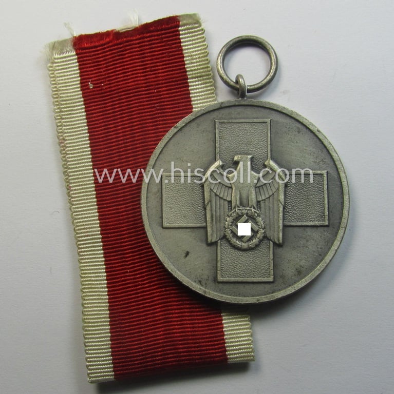 The attractive (bright) silver-toned and (I deem) typical zinc- (ie. 'Feinzink'-) based so-called: 'Deutsche Volkspflege'- (ie. civil-service-) medal came together with its (minimally confectioned- ie. 13 cms. sized) ribbon (ie. 'Bandabschnitt') as recently found. The award - that was presumably never mounted - is a very detailed and/or pronounced example: it has a truly very nice and only minimally 'tarnished' age-patina and was most certainly never cleaned nor polished (as can be seen on the pictures). The medal came together with its neat piece of bright-red-coloured- (ie. not-faded) ribbon as issued and/or found. The award was recently found at a German private-household and was truly never before in collectors'-hands. Simply an attractive 'Deutsche Volkspflege'-set that will be hard to be upgraded and that is I deem accordingly priced!