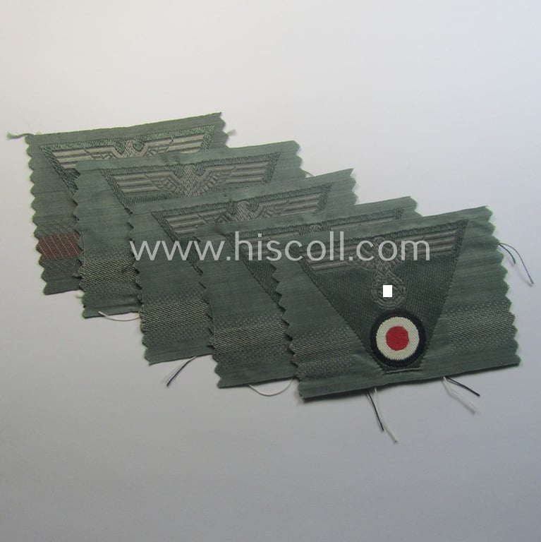 I recently uncovered a small stack of of the 'standard-issue'-type, WH (Heeres) so-called: 'M43-pattern'-cap-eagle/cocarde (ie. cap-trapezoid or: 'Mützentrapez') as was specifically produced for usage on the so-called: 'M-43'-model field-caps (ie. 'Einheitsfeldmützen') and that come all five in a simply never used- (ie.still 'virtually mint- ie. unissued'-), condition. The pieces are executed in the so-called: 'BeVo'-weave-pattern and were simply never confectioned nor cap-attached and come as 'carefully cut-off the role': all five pieces come in an overall very nice- ie. simply never used- nor mounted ie. 'virtually mint- ie. unissued', condition. The pieces are executed in bluish-grey-coloured linnen on a field-grey-coloured (and/or also linnen-based) background and do show some minimal staining ie. storage-age only (as can be seen on the pictures). My asking-price is naturally intended per single specimen. Simply a neat occasion to aquire an attractive and 'BeVo'-woven cap-trapezoid for a competitive price!