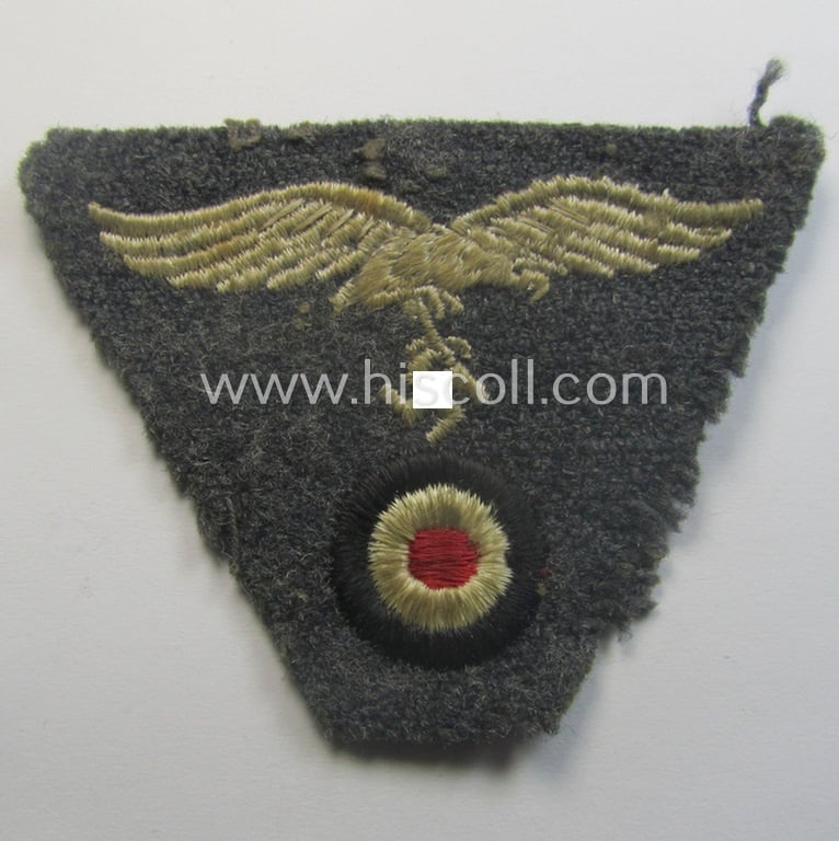 This is an attractive - and actually fairly scarcely encountered! - WH (Luftwaffe) so-called: 'M43-pattern'-cap-trapezoid (ie. 'Mützentrapez') being a machine-embroidered and clearly used- (ie. cap-removed-) example that is executed on a bluish-grey-coloured- and/or woolen-based background and that comes in an overall nice- (ie. just moderately used- and/or worn-), condition. Of interest is, moreover, the fact that this example was clearly cap-removed: it does show some stitching-remains and an (unusually seen!) metal 'snap' used to attach this piece. Simply a nice opportunity to acquire an attractive Luftwaffe-related- and/or trapezoid-shaped cap-badge that can easily be used to restore any bluish-grey-coloured 'Einheitsmütze' or that is ideally fitted to be stored in any cloth-insignia collection: I deem that I have priced this attractive - and truly used! - example, accordingly!