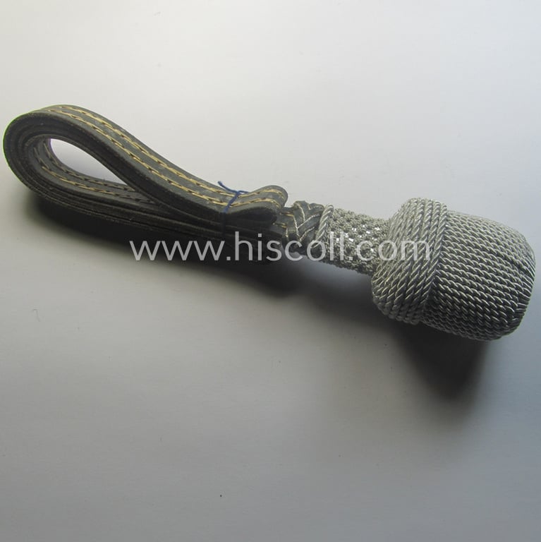 This is a very attractive - and presumably issued albeit simply never used- nor. mounted - example of a darker-green- and/or silver- (ie. multi)coloured and partly leather-based, WH (Heeres) officers'-type sword-knot (ie. 'Portepee' ie. 'Troddel') as was specifically intended for usage on the various WH-parade-swords and that comes in an overall very nice- (I deem still 'virtually mint'- and/or never sword-mounted-), condition. These WH (Heeres) officers'-type sword-knots (ie. 'Portepee' or: 'Troddel') were specifically intended for usage onto the various (parade)swords as worn by 'Offiziere' (ie. officers'-usage). The piece - which is constructed from silver-toned, braid-based material and/or green-coloured leather - is truly void of any age nor wear and comes still tied-together as found (as can be seen on the photos) it is totally void of any damage and is of course still fully functional. The piece was recently uncovered at a German private-household and was never before in collectors'-hands. Simply an attractive example of a WH (Heeres) officer'-type sword-knot that is accordingly priced: maybe the best such neat example I ever had on offer!