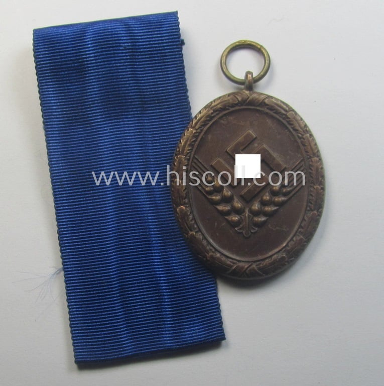 The attractive - and truly fairly scarcely found! - 'Reichsarbeitsdienst der weiblichen Jugend' (or: RADwJ) service-award - being of the typical 'light-weight'- (ie. aluminium ie. 'Cupal'-based) version - truly retains very nice details and has a minimally darkened- (ie. somewhat tarnished) golden-bronze-toned age-patina: it has, most certainly never been cleaned nor polished (as can be seen on the pictures). The piece - that was simply never mounted - came together with its typical period (and nicely folded, ie. 19 cms. long-sized- and/or cornflower-blue-coloured) ribbon (ie. 'Bandabschnitt') as issued. The piece does show a (by me) undecypherable makers'-designation in the ring (as can be noticed on the pictures. It should be noted that these attractive, female-related 'RADwJ-Dienstauszeichnungen' are actually not that easily found and can be graded 'fairly scarce'. Simply an attractive example of this: 'RAD Dienstauszeichnung für weibliche Jugend 4. Stufe in Bronze' that is I deem accordingly priced!