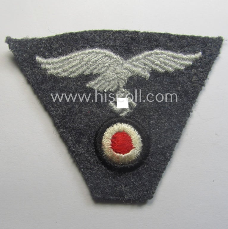 This is an attractive - and actually fairly scarcely encountered! - WH (Luftwaffe) so-called: 'M43-pattern'-cap-trapezoid (ie. 'Mützentrapez') being a machine-embroidered and simply never used example that is executed on a bluish-grey-coloured- and/or woolen-based background and that comes in an overall very nice- (ie. I deem still 'virtually mint- ie. unissued'-), condition. Simply a nice opportunity to acquire an attractive Luftwaffe-related- and/or trapezoid-shaped cap-badge that can easily be used to restore any bluish-grey-coloured 'Einheitsmütze' or that is ideally fitted to be stored in any cloth-insignia collection: I deem that I have priced this attractive - and truly 'minty'! - example, accordingly!