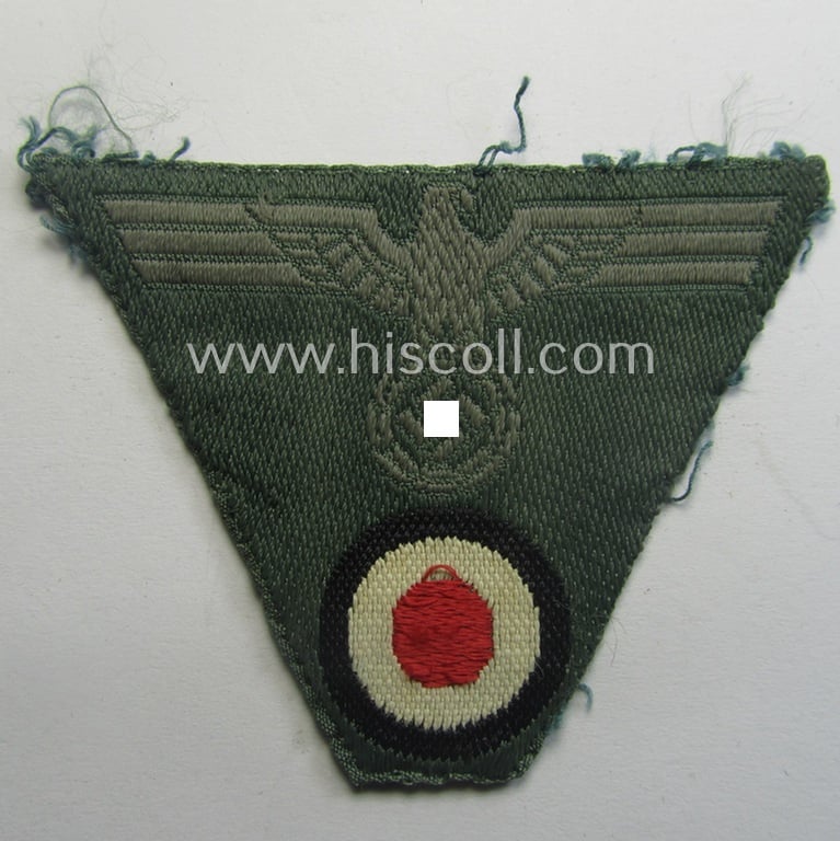 This is a neat - and I deem used and/or carefully cap-removed! - example of the 'standard-issue'-type, WH (Heeres) so-called: 'M43-pattern'-cap-eagle/cocarde (ie. cap-trapezoid) as was specifically produced for usage on the so-called: 'M-43'-model field-caps (ie. 'Einheitsfeldmützen') and that comes in a just minimally used- (ie. I deem once cap-attached-), condition. The piece is executed in the so-called: 'BeVo'-weave-pattern and was nicely confectioned ie. prefolded and/or once cap-attached and comes as recently found. The piece - that was once cap-attached by means of hand-stitching - is executed in bluish-grey-coloured linnen on a field-grey-coloured (and/or also linnen-based) background and does show some minimal age, wear and/or staining ie. storage-age (as can be seen on the pictures). Simply a neat occasion to aquire an attractive, truly worn and 'BeVo'-woven cap-trapezoid for a competitive price!