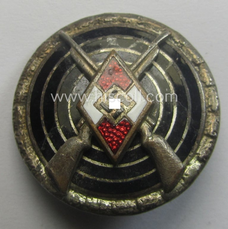 This is an attractive - just moderately used and truly fully undamaged(!) - I deem early- (ie. even pre-war-) period example of a HJ ('Hitlerjugend') so-called: 'HJ-Schiessauszeichnung für Scharfschützen' (or: HJ shooting- ie. marksmans'-badge with oakleaf-wreath) being a nicely maker- (ie. 'RzM - M1/63'-) marked example that comes in an overall nice- (I deem surely issued- and/or just moderately worn-), condition. The smaller-sized badge (which is equally sized as an N.S.D.A.P.-membership lapel-pin) is as stated above, neatly marked on the back with the makers'-designation 'M1/63' as mentioned above. The lapel-pin was never cleaned (some age ie. staining is present) but the piece truly shows no enamel-damage whatsoever (it was most certainly never cleaned nor polished and shows a somewhat tarnished, typical silver-coloured finish). The badge comes naturally mounted onto its fully functional (and unaltered) pin- ie. pin-catch set-up. Simply a neat - and actually not that often seen! - youth-related marksman'-badge: hard to find a better and more nicely preserved example for a more interesting price!