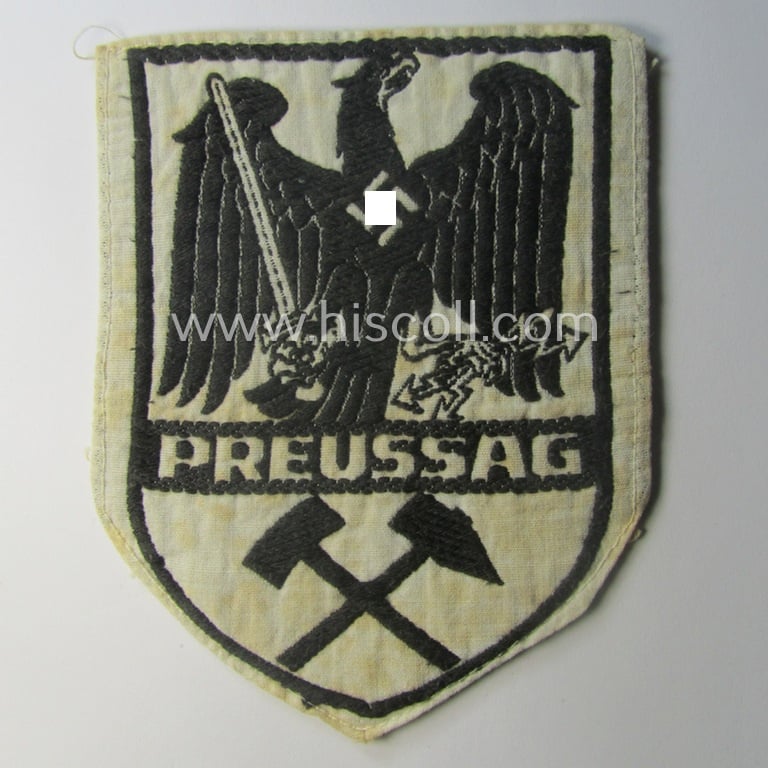 This is a truly very unusual - and/or neatly 'BeVo'-woven! - Third Reich-period sportshirt-patch (ie. 'Abzeichen für das Sporthemd') as was specifically intended for usage by employees working for the company named: 'Preussag AG' and that comes in an overall nice- (ie. clearly issued and just moderately used- ie. worn-), condition. The attractive patch depicts a 'Bergbau'-type eagle-device with below that the text: 'Preussag' and below that two crossed hammers. The neat shield-shaped patch - which is void of an interwoven makers'-designation - is woven in black-toned linnen onto a white-coloured background and measures: 10,7 x 8,5 cms. and was as stated above used and/or carefully shirt-removed (as can be seen on the pictures). The company 'Preussag AG' was established in October 1923 and was formed from various companies (such as the: 'Preußischen Bergwerks- und Hütten-Aktiengesellschaft ' (ie. 'PBHAG'). Simply an attractive piece of TR-period, sports'-related cloth-insignia that would most certainly merit further attention and/or investigative work!