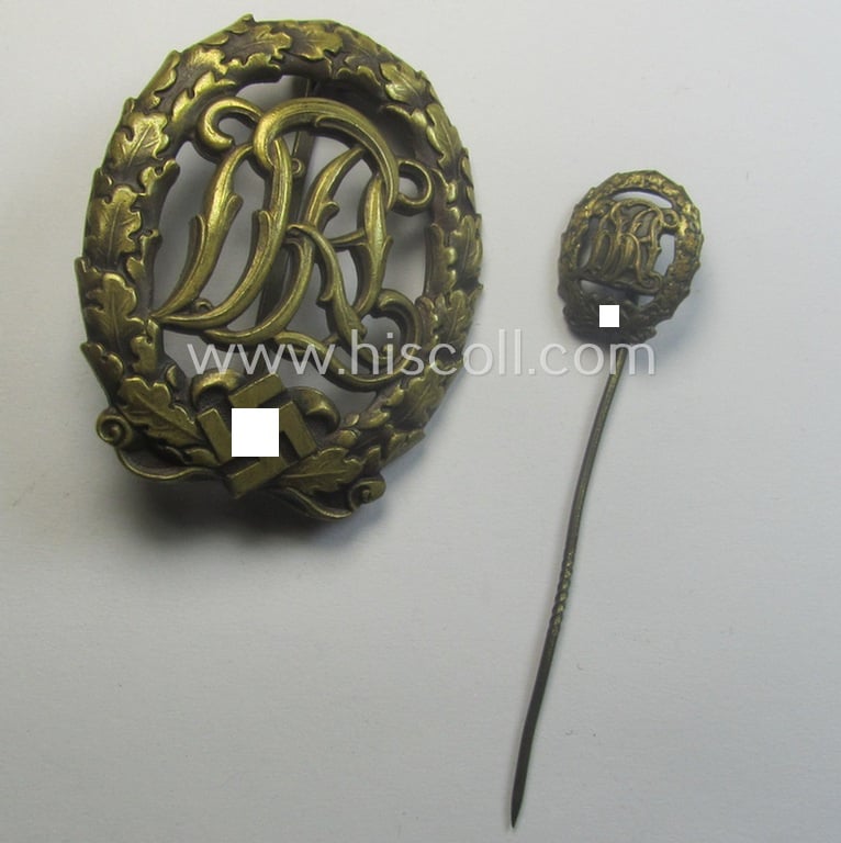 The attractive DRL-sports'-badge on offer here is of the version with swastika and truly retains most of its (quite bright- and/or 'frosted' bronze-coloured!) finish. As stated above, is the badge nicely maker-marked on its back with the makers'-designation: 'Ernst L. Müller - Pforzheim' on its back (as can be seen on the pictures). Next to this, it also bears the 'D.R.G.M.'-marking and number as to be expected for a DRL-sports-badge. The sports-badge - which comes naturally mounted onto its fully functional and totally unaltered pin- and/or pin-catch set-up in place - was I deem never cleaned nor polished and retains a minimally tarnished age-patina (as can be seen on the pictures). Of additional interest is, moreover, the fact that this specimen came with its its accompanying 17-mm. sized miniature (ie. 'Halbminiatur') which is equally nicely preserved and that shows the makers'-designation: 'B.&N. - L.' on its back Simply an attractive DRL-bronze-class-set that will be hard to be upgraded and that is with certainty accordingly priced!