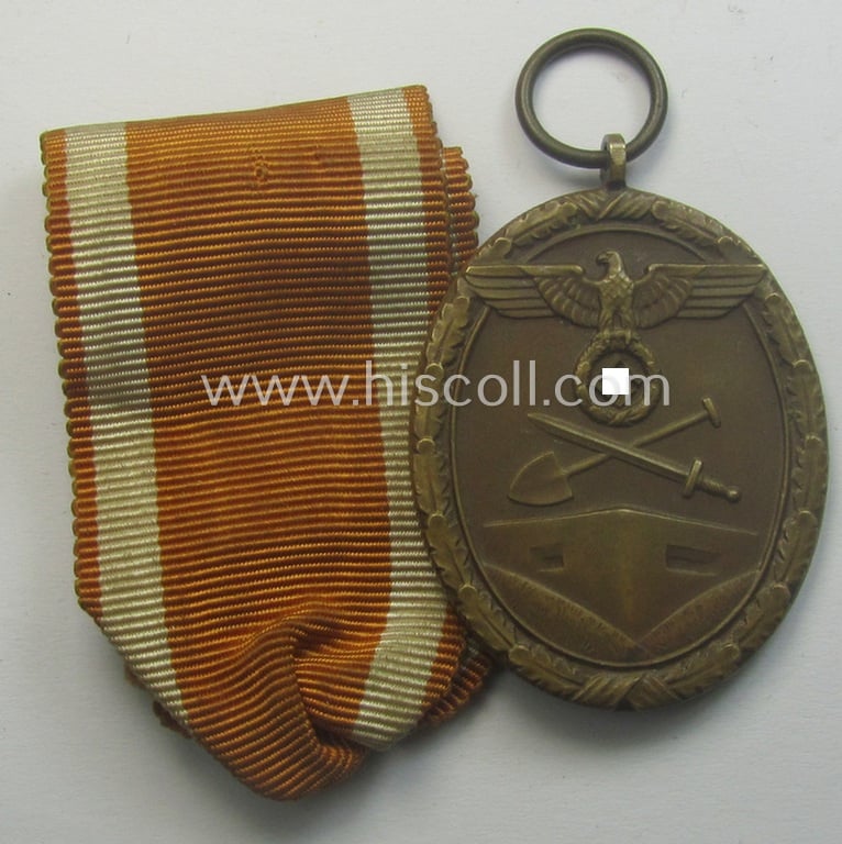 This is an attractive medal-set: 'Deutsches Schutzwall Ehrenzeichen' (aka: 'Westwall'-medal) being a non-maker-marked- and/or 'Buntmetall'-based specimen that came together with its period- (and neatly folded- ie. minimally-confectioned) ribbon (ie. 'Bandabschnitt') as recently found. The neat medal came together with its original, confectioned- (and approx. 19 cms. long-sized- and/or typical mustard-brown-coloured) ribbon as issued and/or stored for decades. The medal - which is a neat 'Buntmetall'-based specimen - has an attractive (albeit minimally darkened) bronze-coloured age-patina (simply caused by decades of storage) and was most certainly never cleaned nor polished and therefore are details and/or finish still very nice and/or crisp. Simply an attractive - and I deem fairly early-war-period! - 'Deutsches Schutzwall Ehrenzeichen' (aka: 'Westwall'-medal)-set that is accordingly priced!