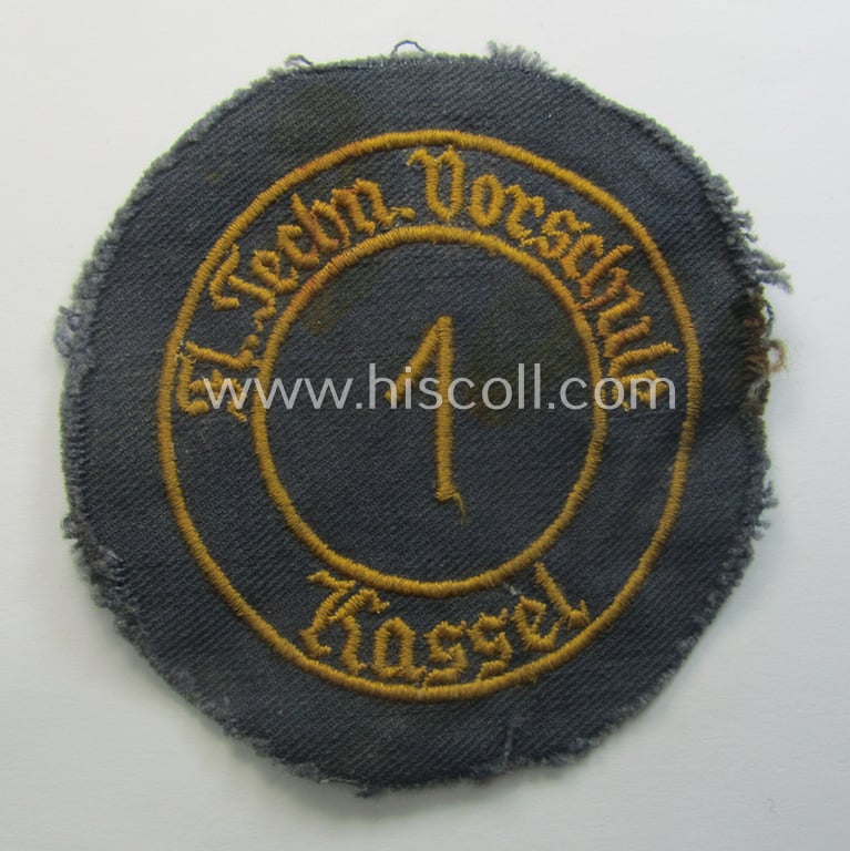 This is an attractive - and actually scarcely encountered! - HJ ('Hitlerjugend'- ie. 'Flieger-HJ'-) related and/or circular-shaped so-called: specialist-armbadge (or: 'Schulabzeichen') depicting the text: 'Techn. Vorschule d. Luftwaffe - 1 - Kassel' and that comes in an overall nice- (I deem issued and just moderately used- ie. once tunic-attached-), condition. These neat circular-shaped arm-badges signified membership within one of the technical preparatory-airforce-schools (or institutes). The badge on offer here shows membership within such a school based in the town of Kassel: there were several of these youth training-institutes - it is said that 32 of such schools existed! - that mostly functioned under the direction of one the larger air-craft industrial companies (such as: 'Focke Wulf', 'Messerschmitt' and others). The neat badge - executed in golden-yellow-coloured (linnen-based) stitching onto a blue-coloured- and/or linnen-based background - shows in its centre a larger-sized '1'-numeral and is void of an extra backing: it just shows some minimal age and/or staining (as can be noticed on the pictures). These circular-shaped badges were instituted as late as 1944 and 'replaced' the until that date used armbands (ie. 'Ärmelstreifen') having a similar text. Simply a very attractive - and surely scarcely encountered! - youth-related arm-badge ie. 'HJ-Schulabzeichen'!