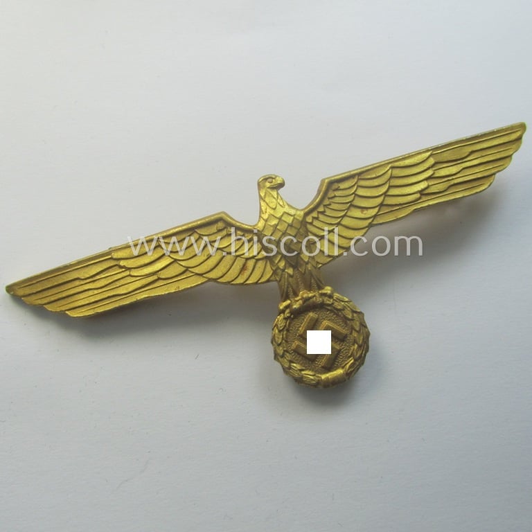 This an attractive - and I deem just minimally used but nevertheless not that easily encountered! - WH (Kriegsmarine o. Heeres) bright-golden-toned- (ie. 'frosted'- ie. 'Feuervergoldet'!) and/or metal- (ie. light-weight- and/or aluminium-) based breast-eagle (ie. 'Brustadler für Sommerrock der Kriegsmarine') as was specifically intended for usage on the white-coloured, naval-type summer tunics and that comes in an overall nice- (ie. just minimally used- and/or worn-), condition. The very detailed piece shows a clear makers'-designation on its back (ie. logo or: 'Raute' with an 'M'-character inside it: as such it was presumably produced by the 'Maedicke'-company). The eagle is a 'standard-pattern'-example that has a very nice, truly 'frosted' and/or detailed appearance. It shows no real damage but shows some obvious wear: most of its so-called: 'hochpolierte Kanten' (or polished sides) are still nicely preserved and/or present (as can be seen on the pictures). The eagle just shows some minimal age ie. staining as to be expected. The piece comes mounted onto its original pin and also retains its (often missing!) 'third attachment-pin' (shaped like a clip as can be seen on the pictures). These attractive tunic-eagles can easily be considered 'fairly scarce'. It should be noted that this pattern breast-eagle was seen on the various naval summer-tunics but could eventually also be used for a WH (Heeres) general-officers'-summer-tunic (there was no difference between the metal breast-eagles used for these two branches). Simply an attractive - albeit minimally used! - WH (Kriegsmarine ie. evt. Heeres-related) breast-eagle that is I deem accordingly priced!