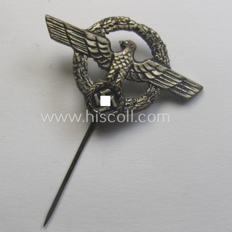 This is an attractive - and actually quite unusally found! - smaller- (ie. 3,5 cms.) wide-sized and/or neatly 'Buntmetall'-based, so-called: 'Deutsche Polizei' (or: German police) lapel-pin (ie. 'Mitgliedsabzeichen') signifying membership witin the 'Deutsche Polizei' as was intended for usage on the civil-attire and that comes in an overall nice-, albeit clearly used ie. worn-, condition. The lapel-pin comes naturally complete with its original long-sized pin and truly retains all of its original, bright silver-coloured finish (as can be noticed on the pictures). A similar example is also figured in the Heering-Hüsken-'Abzeichen'-catalogue, wherein it is given a unique reference-number (9502A) and estimated value of 75 Eu. I deem that I have priced this attractive example, accordingly!