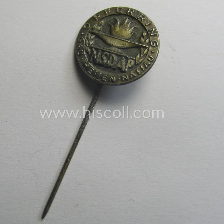 Zinc- (ie. 'Feinzink'-) 'N.S.D.A.P.'-related supporter-pin- (or: 'Freiheitsbund-Abzeichen') being a maker- (ie. 'E.F. Wiedmann'-) marked example showing the text: 'Opferring Gau Hessen-Nassau'