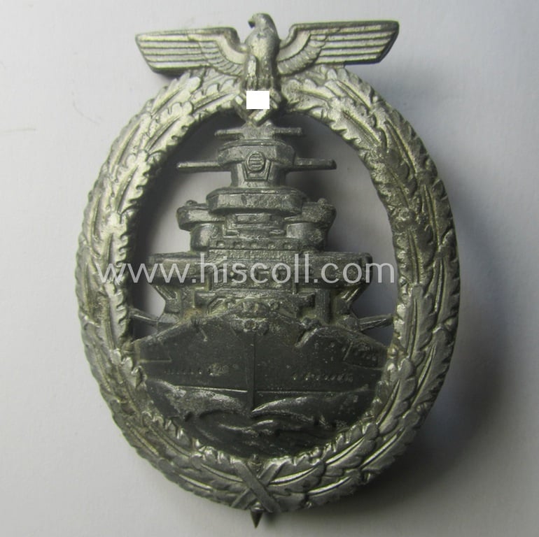 This is a neat - albeit moderately used and worn but nevertheless quite desirable and not that easily encountered! - example of a WH (Kriegsmarine) so-called: 'Flottenkriegsabzeichen' (or: high-sea fleet badge) being a clearly maker- (ie. 'RS'-) marked example that was produced by the Austrian-based: 'Rudolf Souval'-company and that comes in an overall nice- (albeit moderately used- and/or worn-), condition. The attractive zinc- (ie. 'Feinzink'-) based- (and I deem somewhat later-war-period produced-) badge has regrettably lost most of its original golden- and/or silver-toned finish: this has simply faded-away over the years ie. has 'migriert' (as can be seen on the pictures). The catch, pin and/or pin-set-up are naturally present and unaltered. The war-badge is as stated above nicely maker-marked on its back and shows the to be expected 'RS'-logo denoting that it deals with a piece that was produced by the: 'Rudolf Souval'-company as based in the town of Wien (ie. Vienna). The details of this - never cleaned nor polished - badge are still quite detailed and sharp. Simply an attractive 'Flottenkriegsabzeichen' (or: high-sea fleet badge) that is I deem with certainty accordingly priced!