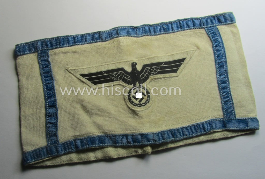 This is a truly attractive - and with certainty rarely encountered! - WH (Heeres) armband (or: 'Dienst-Armbinde') as was (presumably) intended for (graduated) staff-members serving within one of the army-related officers' cadet-schools and that comes in overall very nice- (ie. just minimally used- and/or worn-) condition. The neat armband - which measures 36 x 9,5 cms. - shows the typical Heeres eagle-device as woven in black-coloured(!) linnen onto a white-(ie. somewhat beige-coloured and/or minimally stained) linnen-based background. The eagle - which is period attached to the armband by means of machine-stitching - is neatly executed in 'BeVo'-weave pattern and is only the first such rare example I have ever encountered. The piece - which has clearly been used and worn and shows some obvious wear, age and/or staining - has furthermore the (typical-) light-blue coloured borders and is nicely 'enclosed' within a frame of similarly-styled braid. (Note: It might therefore have been intended for usage by cadets ie. junior-officers who fully completed their training). This example originates from a larger-sized cloth-insignia-collection that was compiled over the years and that I recently acquired for the web-site. Simply a very attractive - and with certainty rarely seen! - Heeres-related 'Armbinde' which is I deem priced according to its desirability and/or unmistaken rarity!