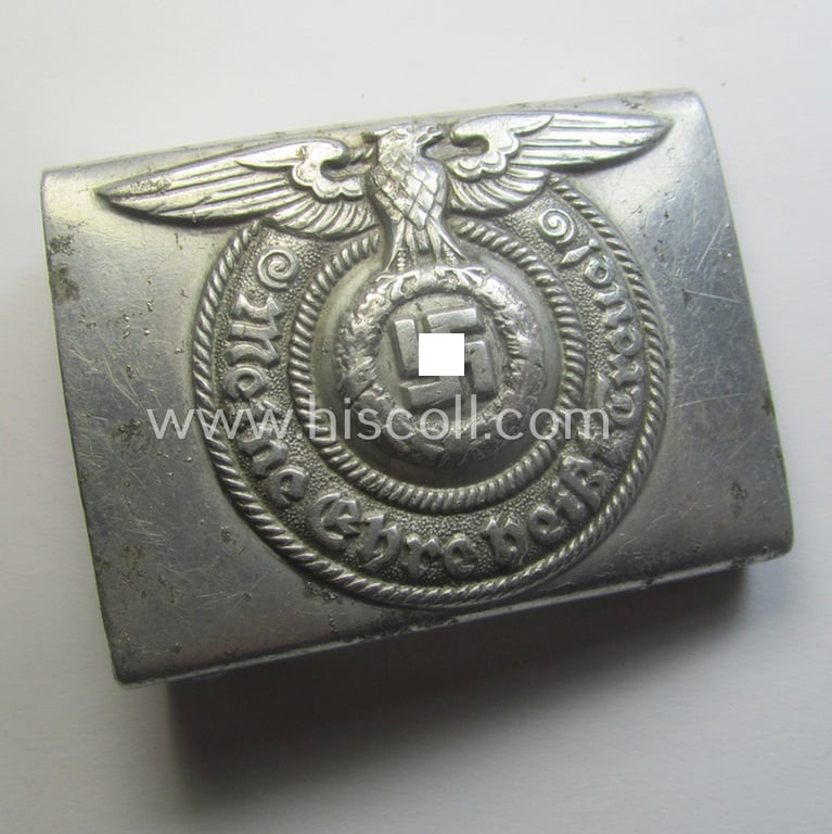 Attractive, SS- (ie. Waffen-SS), aluminium-based enlisted-mens'- (ie. NCO-type-) belt-buckle being a neatly maker- (ie. 'RzM - 822/38 SS'-) marked example that comes in a clearly used- ie. worn, condition