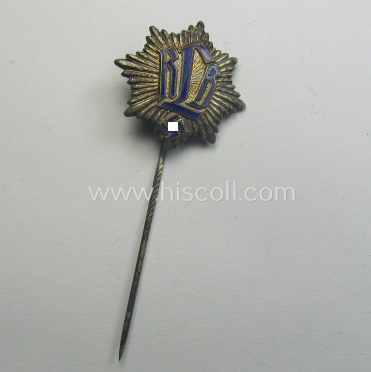 This is an attractive example of a first pattern- (and/or silvered- and neatly semi-enamelled!) so-called: RLB- (ie. 'Reichluftschützbund') so-called: 'Zivilabzeichen' (or: civil-attire badge) that is bearing a maker- (ie. 'Hofstätter - Bonn') and/or patent-pending- (ie. 'Ges.Gesch.'-) marking on its back and that comes in an overall nice- (albeit just moderately used- ie. worn-), condition. The piece has stunning (and totally undamaged!) blue-coloured enamel and comes mounted onto its original, long-sized pin-set-up (as can be seen on the pictures). The piece has most certainly never been cleaned nor polished and is just a tiny bit stained ie. tarnished. A similar badge is also figured in the 'Heering-Hüsken'-lapel-pin-catalogue, wherein it is given the unique reference number: '5909A'. Simply an attractive and desirable 'RLB'-related item: hard to encounter a nicer example for a more interesting price!