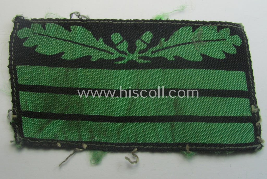 This is an attractive - very desirable, clearly used- and/or carefully tunic-removed albeit regrettably single! - officers'-pattern, WH (Heeres o. Waffen-SS) rank-insignia-bar (ie. 'Rangabzeichen für die Tarnuniform') as was intended for usage on the various camouflaged-uniforms by a junior-ranked officer holding the rank of 'Hauptmann' (ie.: 'SS-Hauptsturmführer') being a typical, printed example as executed on typical silk-like material (ie. 'Kunstseide') and that comes in an overall very nice- (ie. cleary used- ie. worn- and/or carefully tunic-removed-), condition. The piece - which is of the 'printed pattern' as executed in black on a bright-green-coloured and/or 'silk-like'-type, linnen-based background - shows a single oakleaf-bar and three square-sized rank-bars signifying that it was intended for usage by a junior-officer with the rank of: 'Hauptmann' (ie.: 'SS-Hauptsturmführer'). The piece is just a tiny bit stained caused by moderate wear and/or decades of storage but is simply nicely preserved over the years: it was once stitched onto a tunic by means of a machine and still shows some stitching- and/or thread-remains (as can be seen on the pictures). Simply an attractive - and actually not that often encountered! - truly use, WH (Heeres o. Waffen-SS) rank-insignia-bar that is with certainty accordingly priced: too bad that it is only a single specimen!