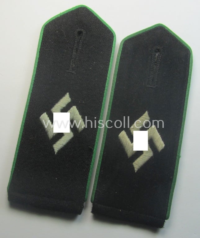 This is an attractive - minimally mis-matched but nevertheless actually scarcely encountered! - pair of enlisted-mens'- (ie. NCO-) type shoulderstraps as was piped in the bright-green- (ie. 'grüner'-) coloured branchcolour as was specifically intended for usage by a member who served within the notorious 'Sicherheitsdienst'- (ie. 'SD'-) related so-called: 'Schützmannschaften' (ie. 'Schuma') and that comes in an overall nice- (and I deem only moderately used- ie. worn-) condition. The 'pointed-styled' straps - which measure approximately 12,2 cms. in length each - have (as to expected) the black-coloured- and (smooth)woolen-based 'upperdecks' and do show the interwoven, diamond-shaped swastika-signs (as executed in silverish-grey linnen as can be seen on the pictures). The neat pair comes mounted onto its functional tongues and does show the desirable, 'silk-like'-type piping attached (as always). The pair shows the black-coloured- (ie. 'Waffen-SS'-related!) 'upperdecks' and as such signified the close interrelation between the - notorious! - 'Schuma'-units and the German police (ie. 'Polizei') ie. Waffen-SS and/or SD-units. The pair is in my opinion only minimally used and does show some minimal age, wear and/or staining. These notorious 'Schützmannschaften' (ie. 'Schuma') were staffed with men entirely coming from the Baltic states and had a very bad reputation. In any case is this a sound opportunity to acquire a very scarcely encountered pair of (I deem) just minimally used SD-related shoulderstraps: I deem that I have priced this pair according to its minimally mis-matched condition!