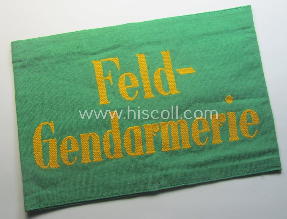 Wehrmacht-related, bright-green-coloured and/or linnen-based armband entitled: 'Feldgendarmerie' (as was specifically intended for usage by the staff of the notorious: 'Feldgendarmerie-Truppen')