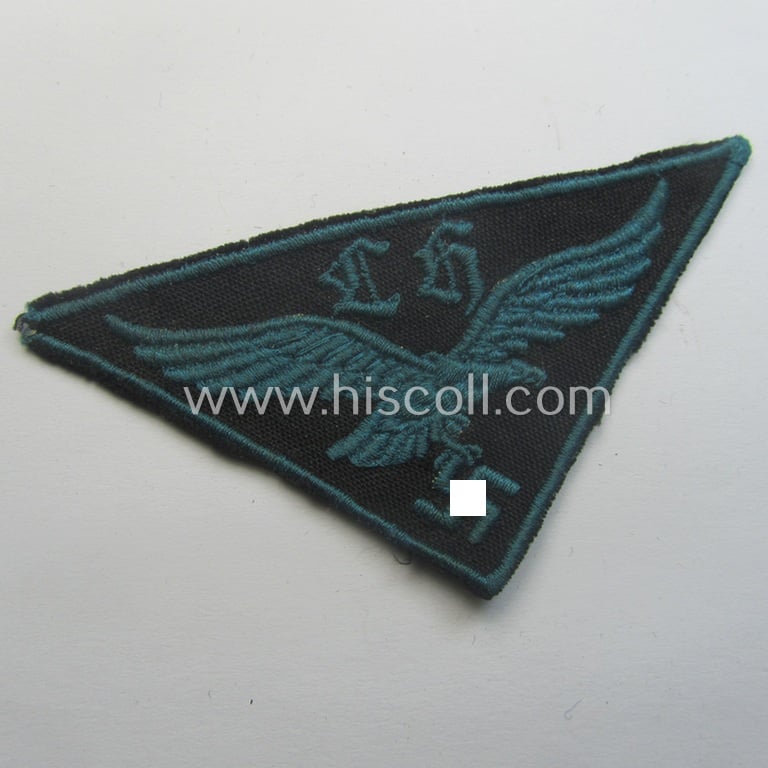 This is a neat - and actually not that easily found! - example of a WH (Luftwaffe- ie. Hitlerjugend-) related- and/or nicely machine-embroidered- (ie. trapezoid-shaped) breast-badge (ie. eagle-device) as was specifically intended for usage by a: 'Flakhelfer' (ie. later-war-period, youthfull, anti-aircraft staff-member) and that comes in an overall very nice- (ie. clearly worn- and/or once tunic-attached (and carefully removed-), condition. The badge on offer here is a detailed example that is executed in typical blue-coloured, linnen-based thread as machine-woven on a black-coloured- (and also linnen-based) background. The badge - which is regular-sized and measures from point to point approximately 8,2 cms. - was clearly and carefully confectioned and folded and shows some truly minimal aging and/or minimal staining. Simply an attractive - and not that easily found! - WH (Luftwaffe ie. Hitlerjugend-) related breast-badge that will be hard to be upgraded and that is - I deem - accordingly priced!