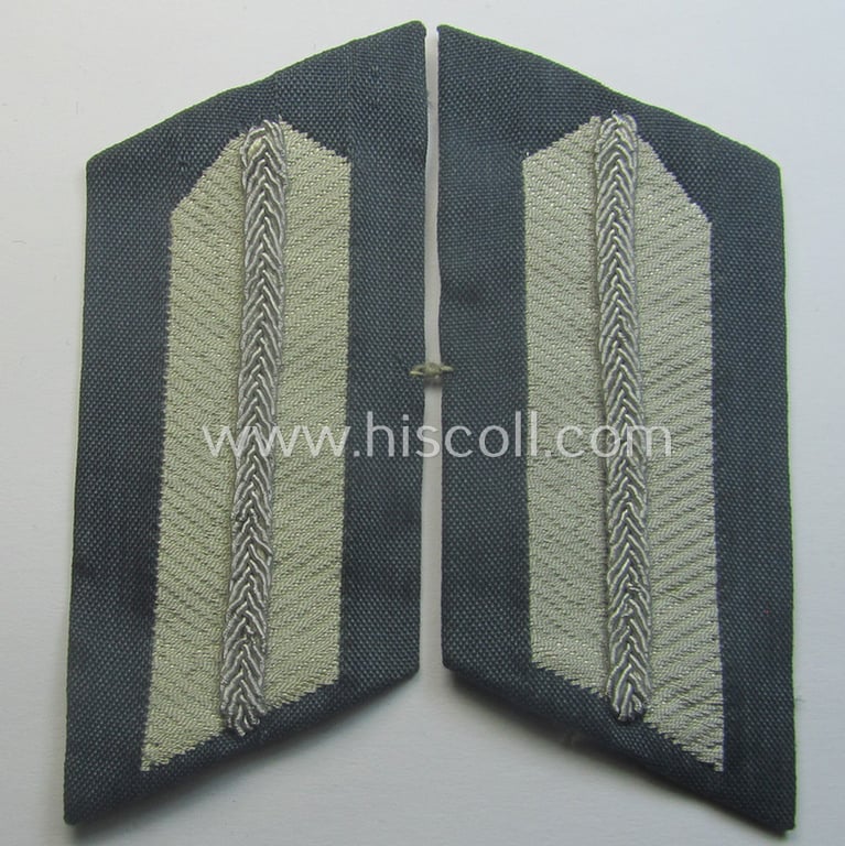 This is an attractive - typical later-war-period and entirely 'BeVo'-woven! - WH (Heeres) officers'-type collar-tab-pair (ie. 'Kragenspiegel für Offiziere des Heeres m. Sonderführer-Dienstgrad') as was specifically intended for usage by an officer who served as a: 'Sonderführer Z' (or: specialised officer with specifically assigned tasks) and that comes in an overall very nice- (ie. simply never worn- ie. still 'virtually mint- ie. unissued'-), condition. The neatly 'BeVo'-woven collar-tab pair - which is backed with beige-white-coloured- and/or buckram-based material as is more often observed - comes still sewn- ie. attached together as issued (as can be seen on the pictures). These tabs were the later-war-period, 'standard-issue'-version of the officers'-type 'Sonderführer'-collar-tabs. Both tabs are executed in the (typical) dove-grey (ie. 'grauer'-) toned linnen and are just a tiny bit stained due to decades of storage and/or handling. Of additional interest is, moreover, the fact that one of the tabs show an inked numeral on its back that reads: 'D.R.G.M…..' as more often. Simply a great set of scarcely found 'Heeres Sonderführer'-related officers'-pattern collar-tab-pair that comes in an overal wonderful condition: hard to find a nicer and more attractive pair for a more interesting price!